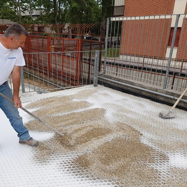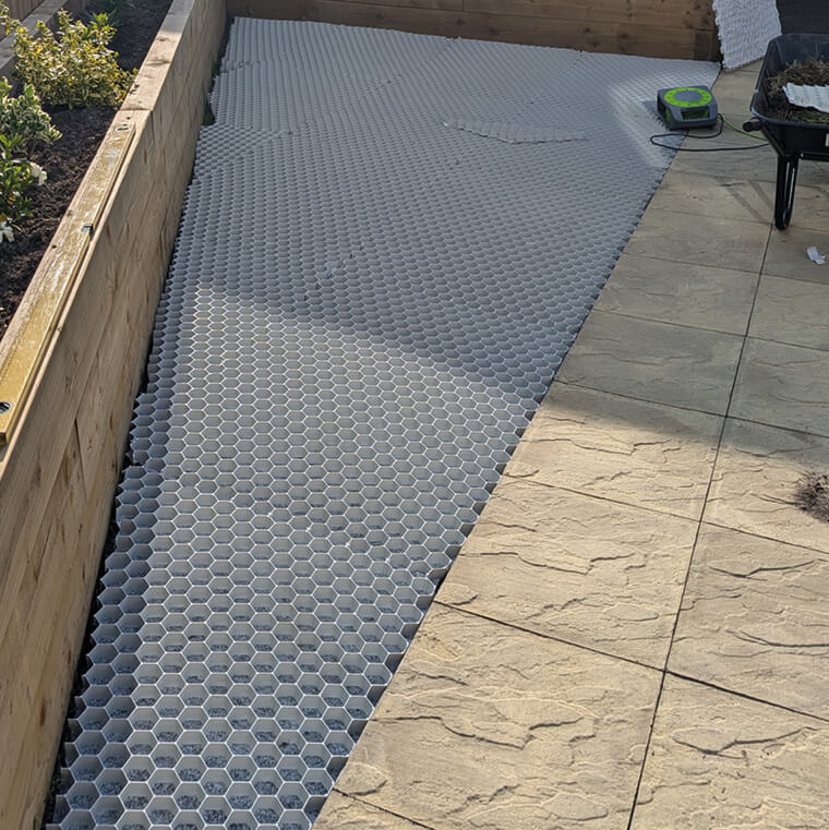 The honeycomb structure (for gravel and pebbles) and geotextile base are made of recycled polypropylene (PP). The structure of the cells creates tightly compacted pockets that securely hold loose gravel, forming a durable, porous, water permeable surface.