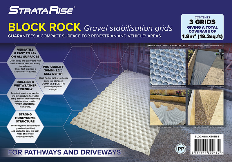 BLOCK ROCK is a versatile, low-profile gravel stabiliser, featuring a superior 30mm depth and designed to provide excellent aggregate coverage (30m² per tonne). Quick and easy to lay, BLOCK ROCK provides a durable, low-maintenance solution for garden paths, driveways, patios and more. Thanks to its honeycomb structure and geotextile fabric layer, weed control is assured whilst rainwater is easily absorbed into underlying soil.
